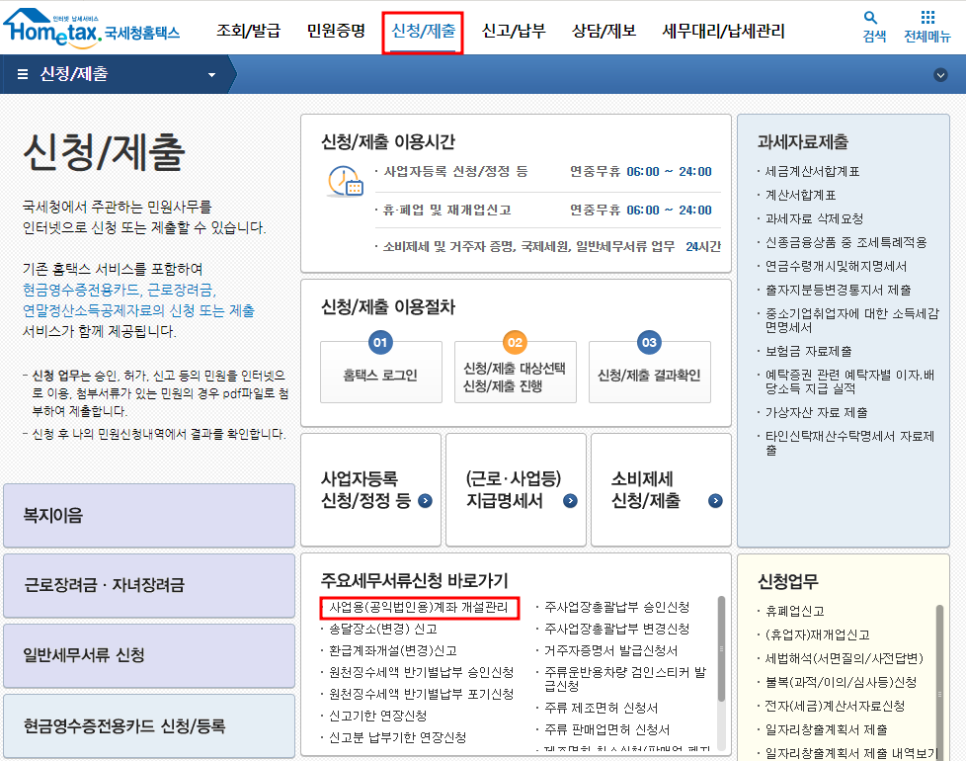 2. 신청/제출 → 주요세무서류신청 바로가기 → 사업용(공익법인용)계좌 개설관리 클릭