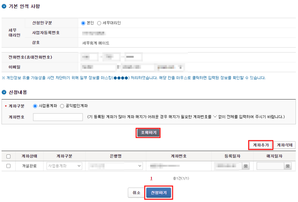 3. 신청내용 중 조회하기를 클릭 → 계좌추가 클릭 → 계좌정보 입력 후 신청하기 클릭